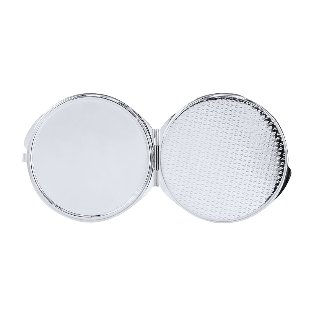 Specchio pieghevole metallico con piastra per sublimazione (non integrata nel prodotto, ideale per stampare e incollare successivamente). Con due specchi interni: 1X e ingrandimento 2X. 1 Aumenti 2X