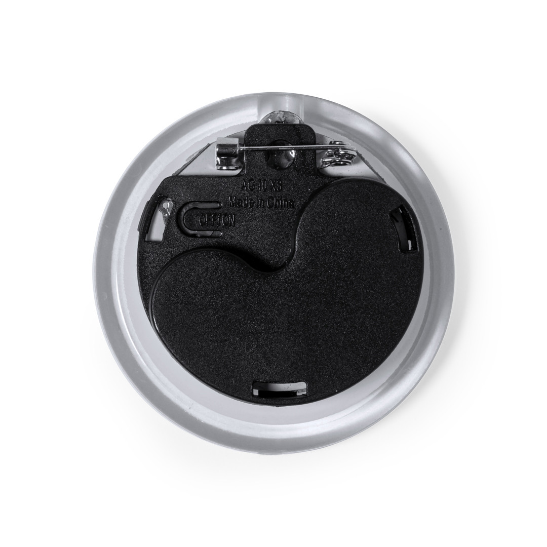 Originale spilla con luce LED, alimentata da batteria a bottone -inclusa-. Dispone di un pulsante sul retro con tre modalità di illuminazione (luce fissa e luce lampeggiante, veloce o lenta). Con spilla da balia e presentato singolarmente in una scatola dal design kraft. Luci Led Multicolore. Luce a 3 Posizioni, Fissa e Lampeggiante. Pile Bottone Incluse