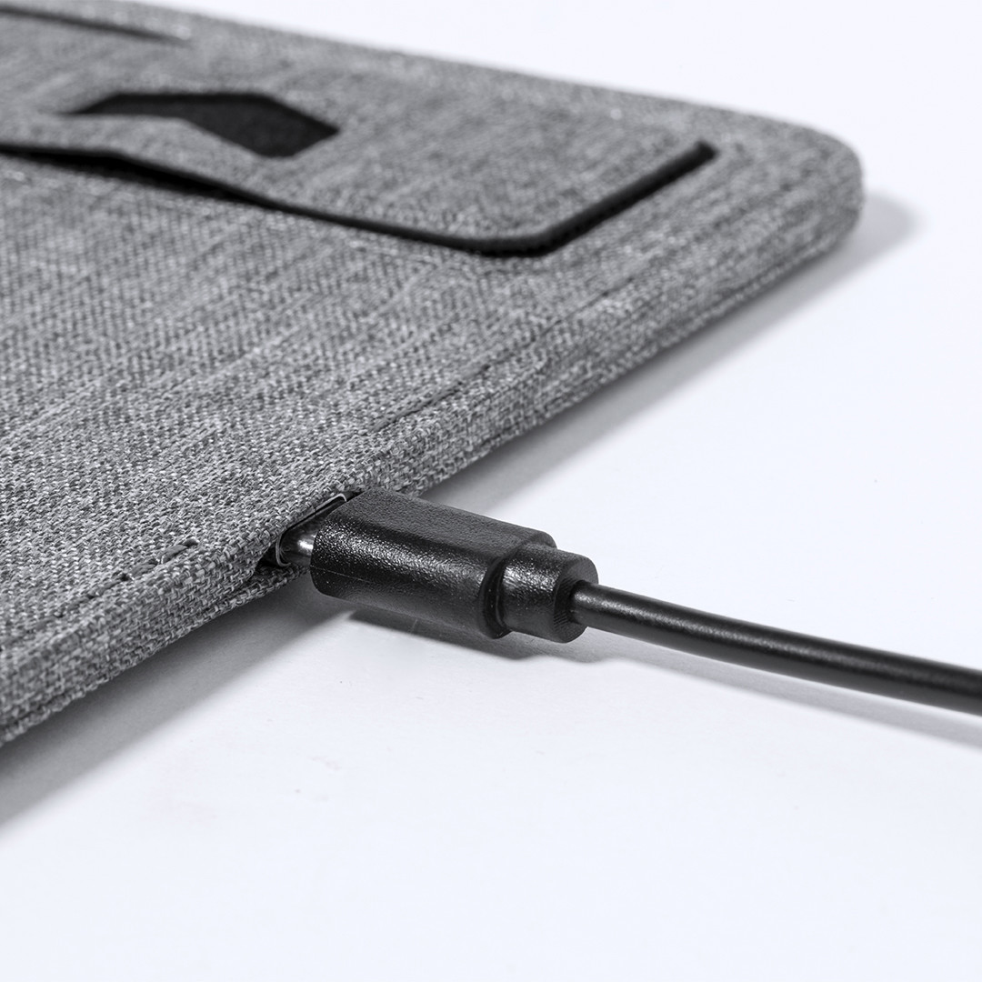 Elegante e funzionale tappetino per mouse realizzato in morbido poliestere RPET. Con ingresso Type-C - cavo Type-C nero incluso - e caricatore wireless da 15W, compatibile con i dispositivi dotati di tecnologia di ricarica wireless Qi. Include un supporto per smartphone e un portapenne. Con base antiscivolo che garantisce stabilità e comfort di utilizzo. Include un manuale di istruzioni in inglese e spagnolo. Presentato in una scatola individuale dal design kraft e in un sacchetto riciclato.Il materiale RPET è realizzato con plastica riciclata per incoraggiare il riutilizzo dei rifiuti plastici e contribuire alla sostenibilità del pianeta.Prodotto secondo gli standard RoHS e in conformità ai seguenti requisiti di sicurezza:Sistema di protezione dal surriscaldamento.Sistema di protezione dal sovraccarico.Sistema di blocco per evitare cortocircuiti. Wireless 15W. Antiscivolo