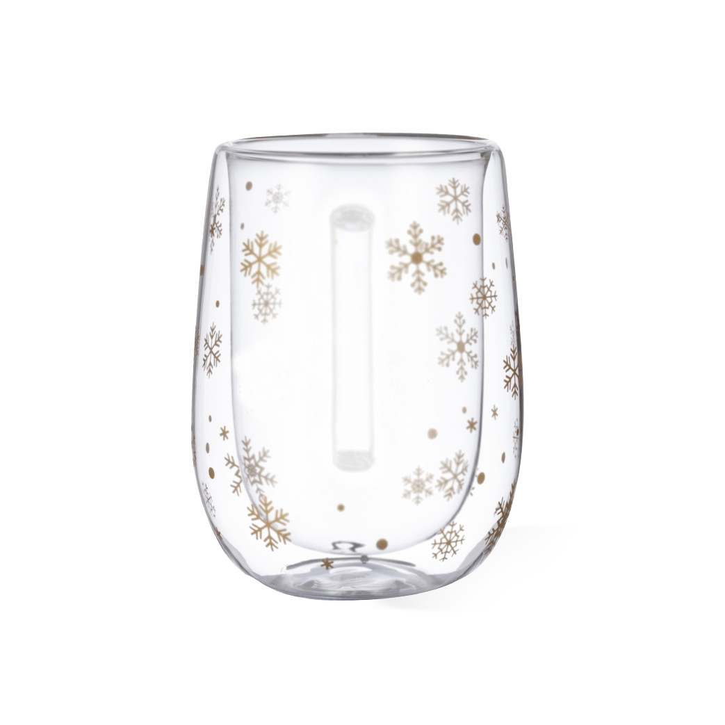 Tazza termica a doppia parete con capacità di 400 ml. Con originale design a fiocco di neve e speciale area di stampa sul fronte. Realizzata in vetro borosilicato, che offre un'eccezionale resistenza e durata, prolungando la sua vita utile e può essere riutilizzata innumerevoli volte.Presentato in una scatola di design nera con illustrazione color oro. 400 ml