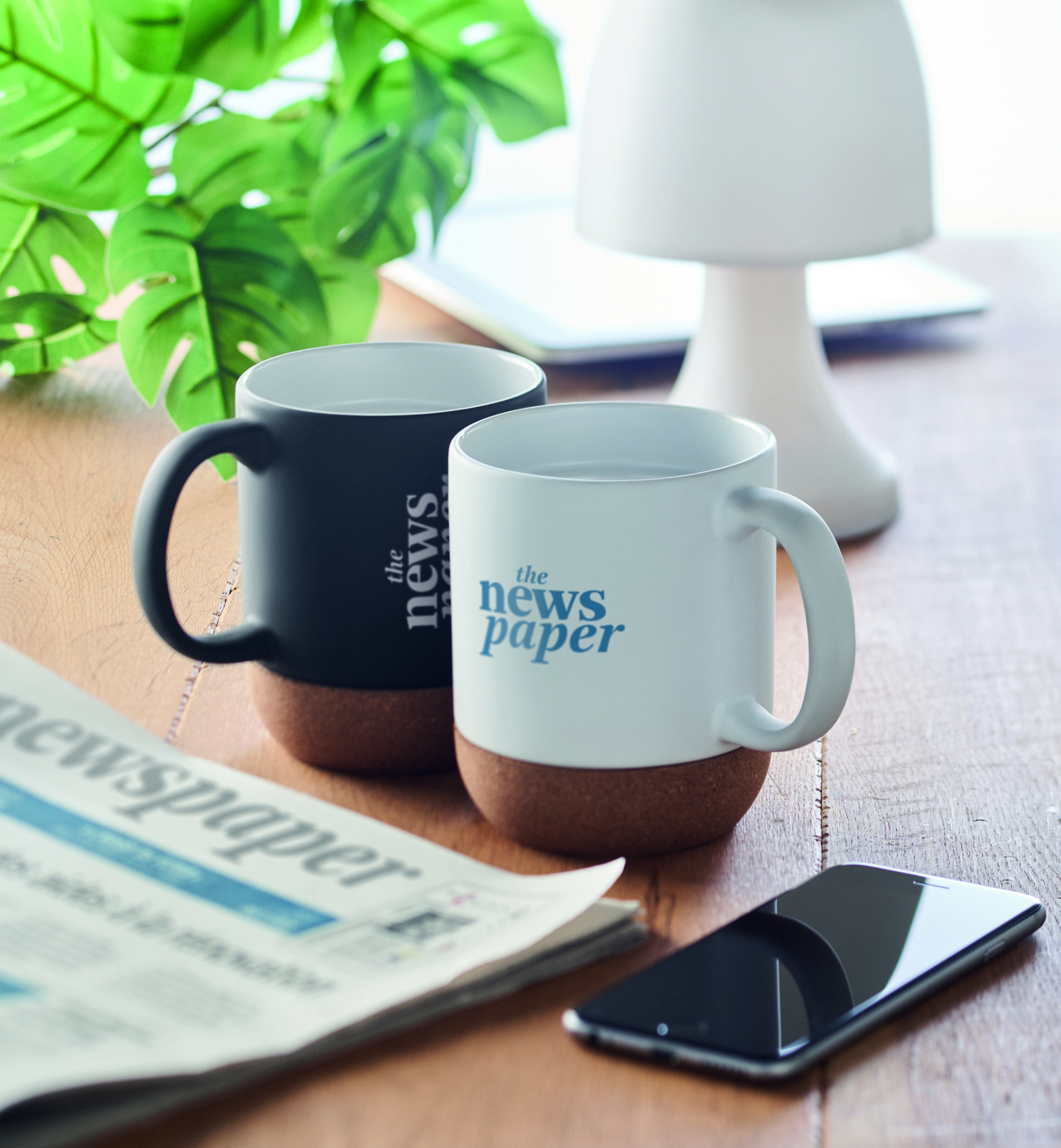 Tazza in ceramica opaca con dettaglio della base in sughero. Capacità: 300 ml. Con un rivestimento speciale per l'incisione laser