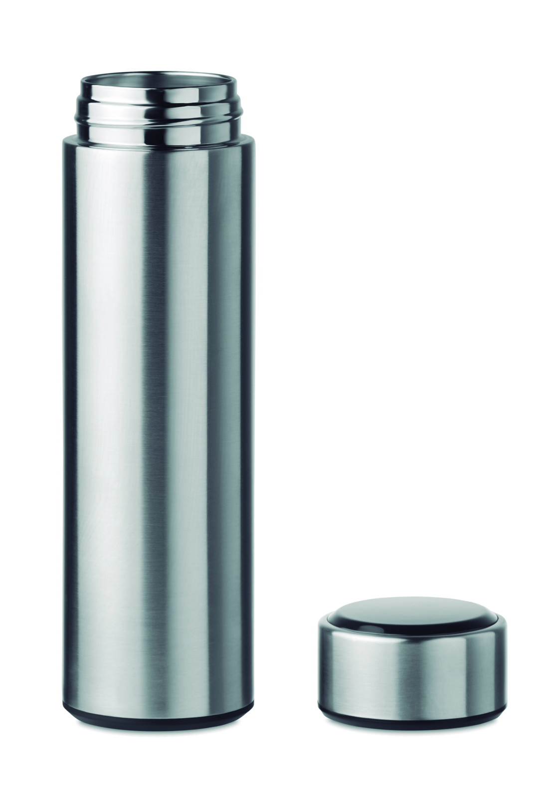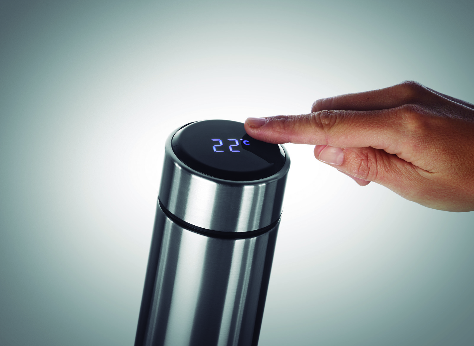 Thermos doppio strato isolante in acciaio inossidabile, antigoccia. Termometro touch a LED incorporato sul tappo, infusore interno. Funziona con 1 batteria CR2032 e sostituibile. 450ml.Antigoccia.