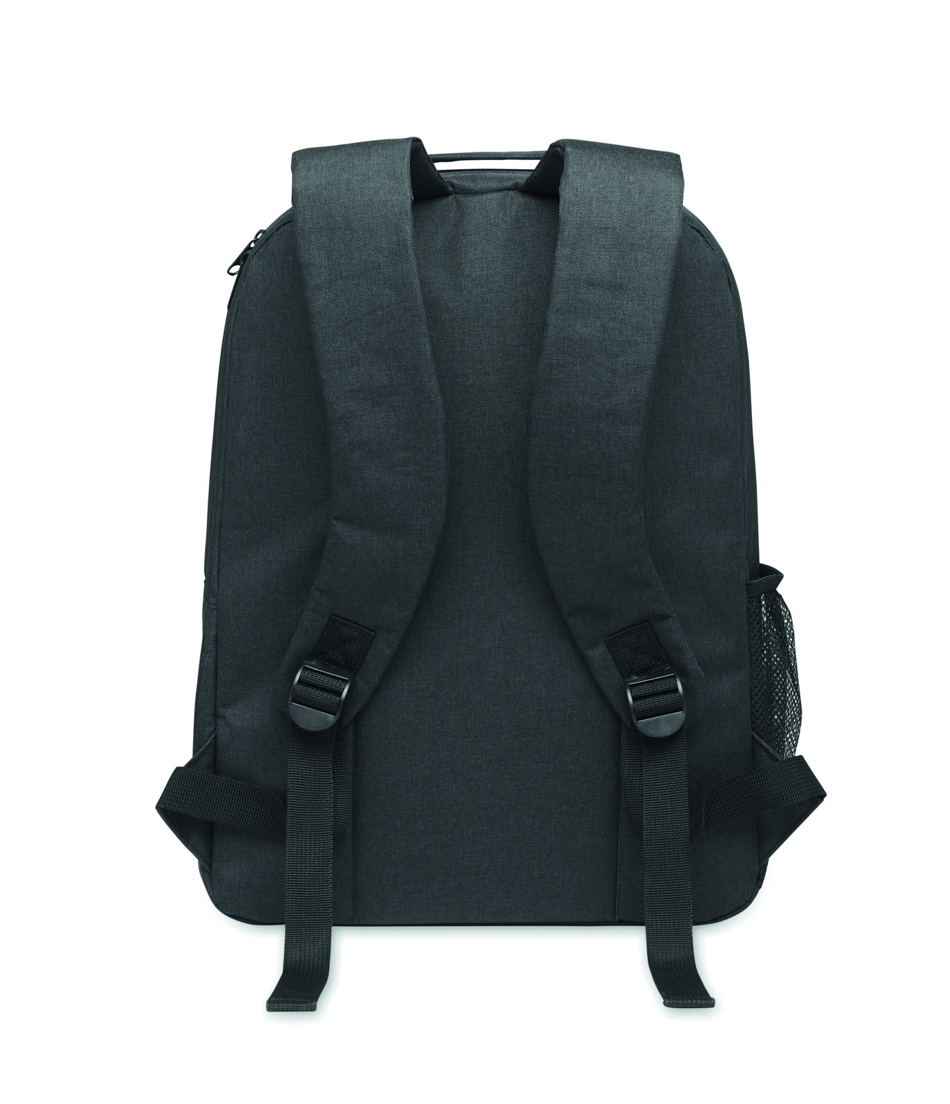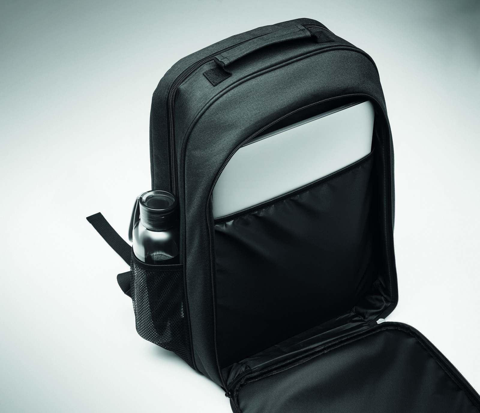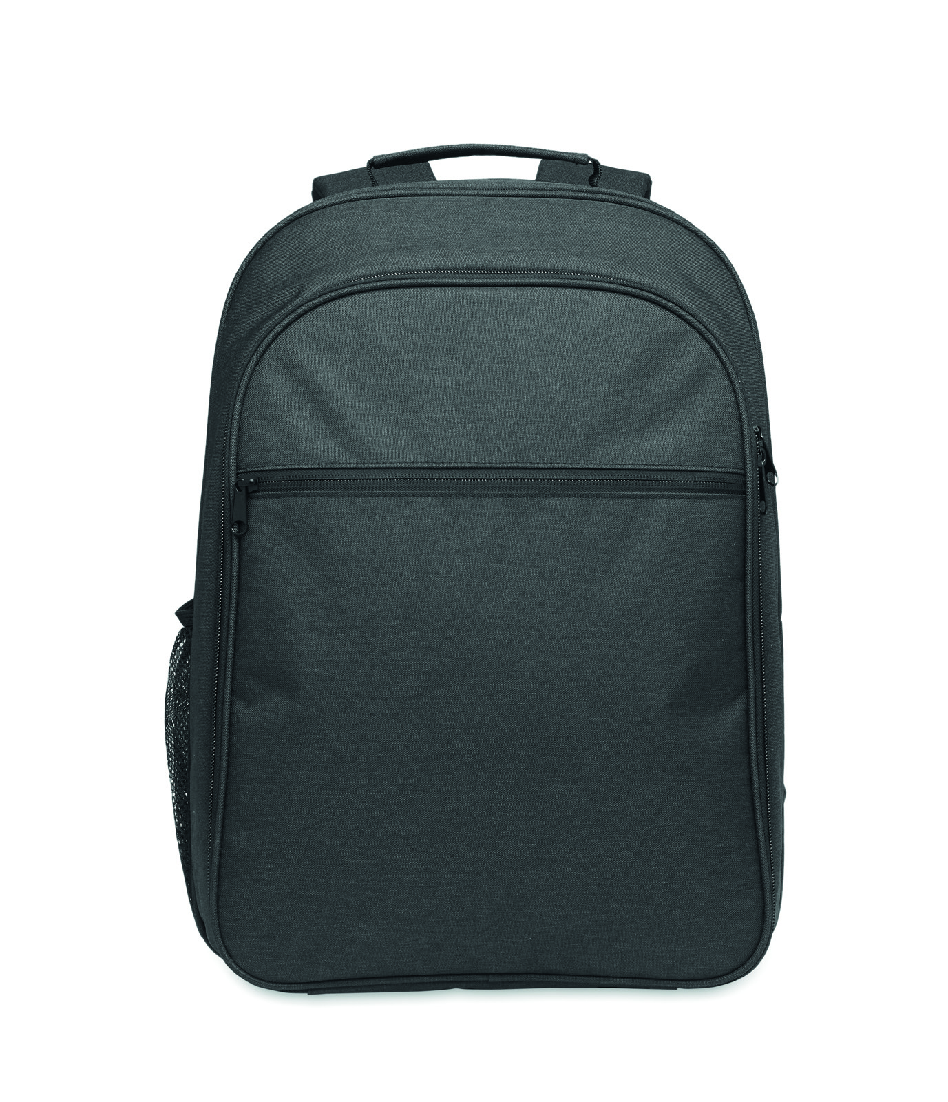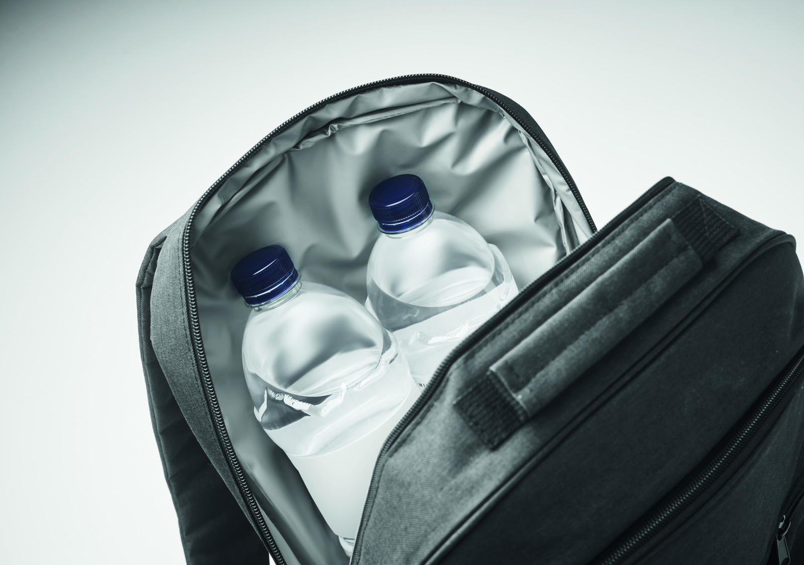 Zaino refrigerante in 300D RPET con scomparto per laptop da 15 pollici. Tasca frontale con cerniera e scomparto laterale in rete.