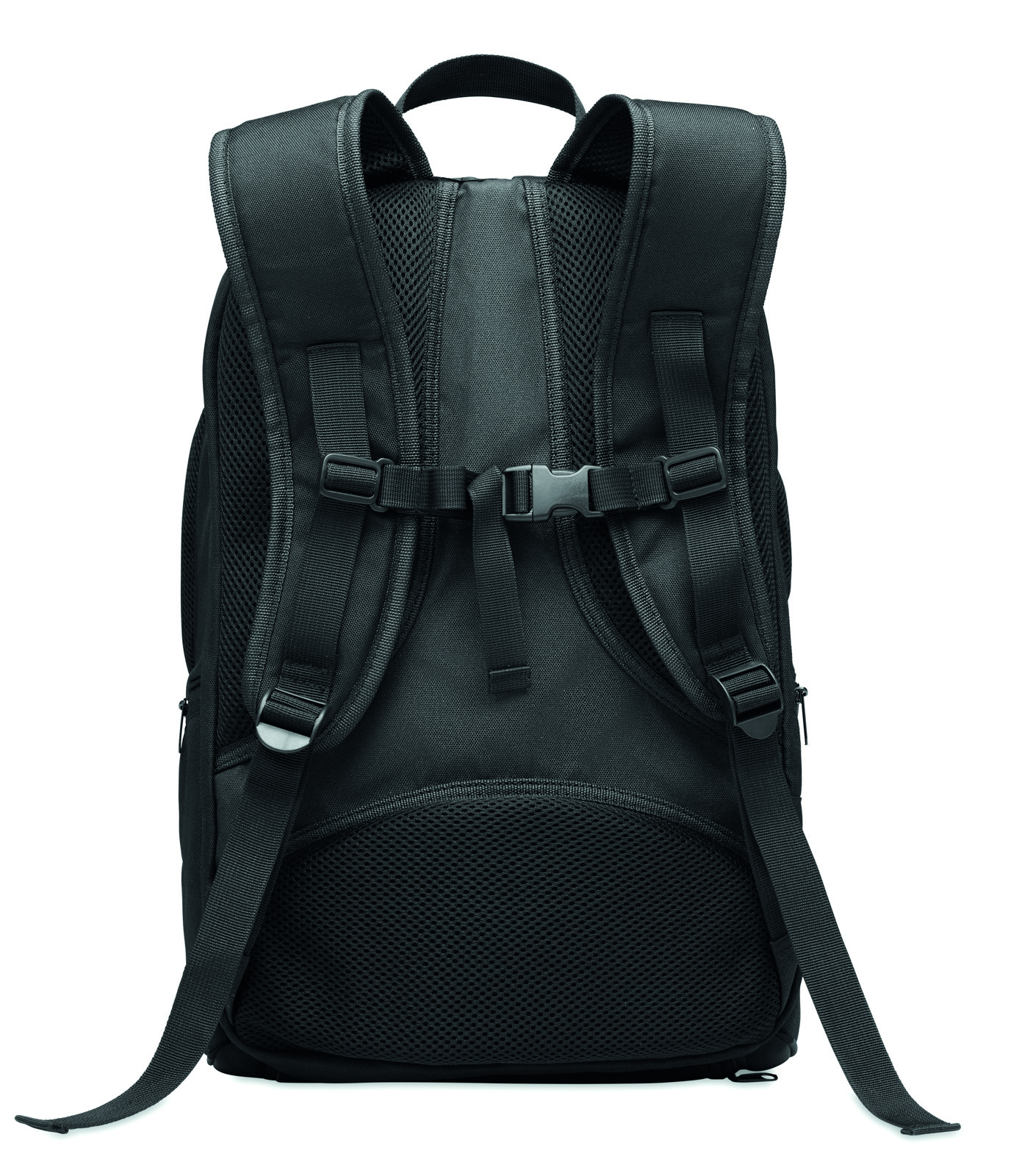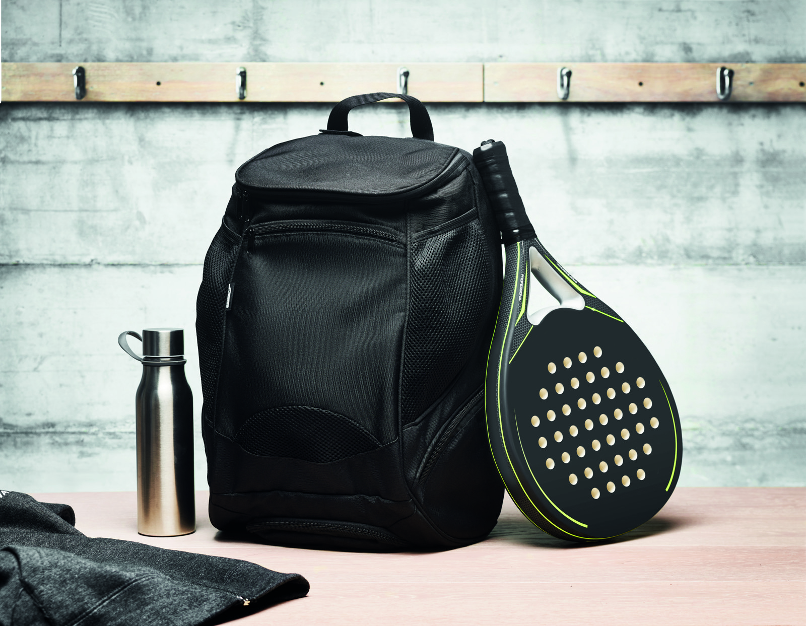 Zaino sportivo multifunzionale in RPET 600D con diversi scomparti (incluso uno scomparto imbottito per la racchetta da padel). Include tracolla regolabile.