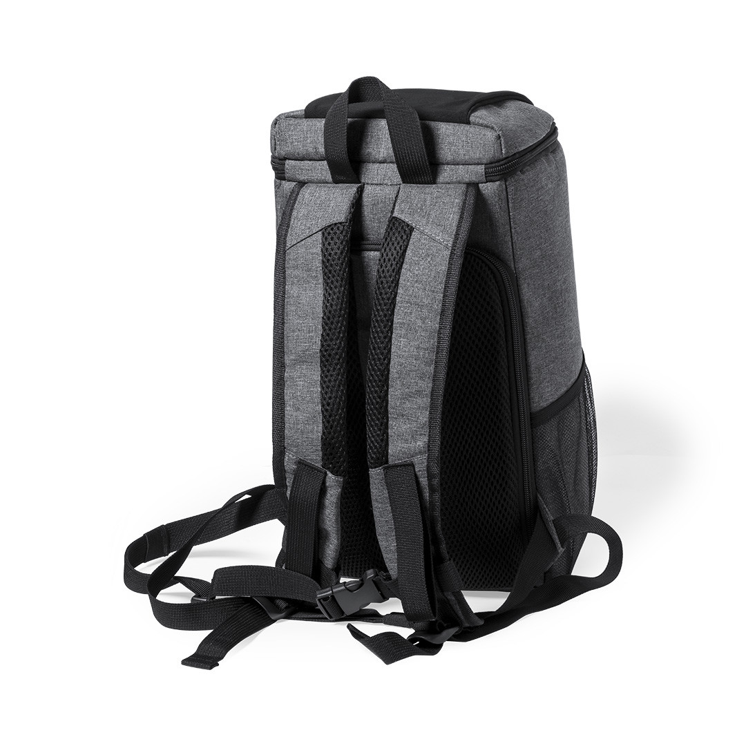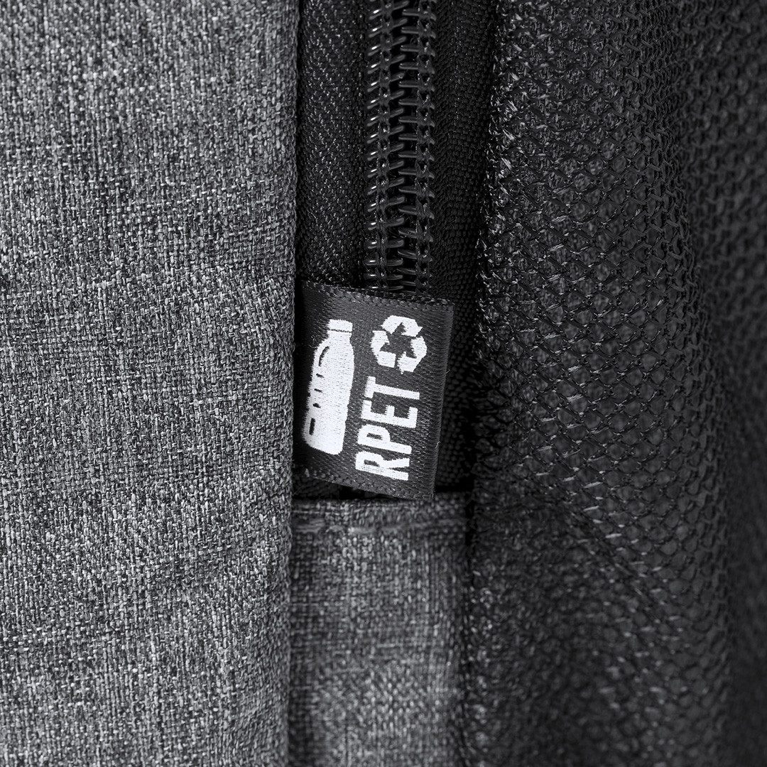 Zaino frigo da 10L della linea natura, realizzato in resistente poliestere RPET 600D di alta qualità, prodotto in plastica riciclata per promuovere il riutilizzo dei rifiuti plastici e contribuire alla sostenibilità del pianeta. Scomparto principale con chiusura a doppia zip e fodera in PEVA. Tasche laterali in rete e tasca frontale ad accesso rapido con chiusura a zip e tiretto. Fascia elastica in alto e tasca sul retro, completamente imbottita. Distintivo RPET sull'etichetta. Imbottita